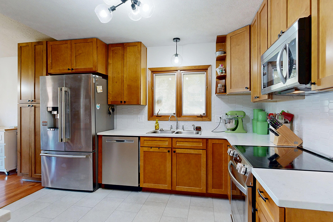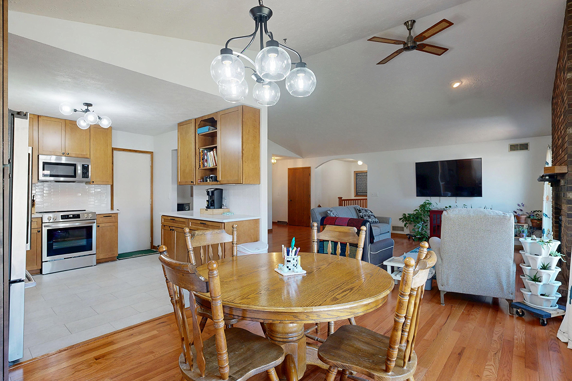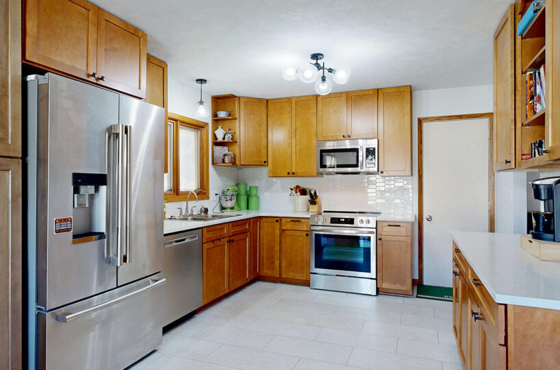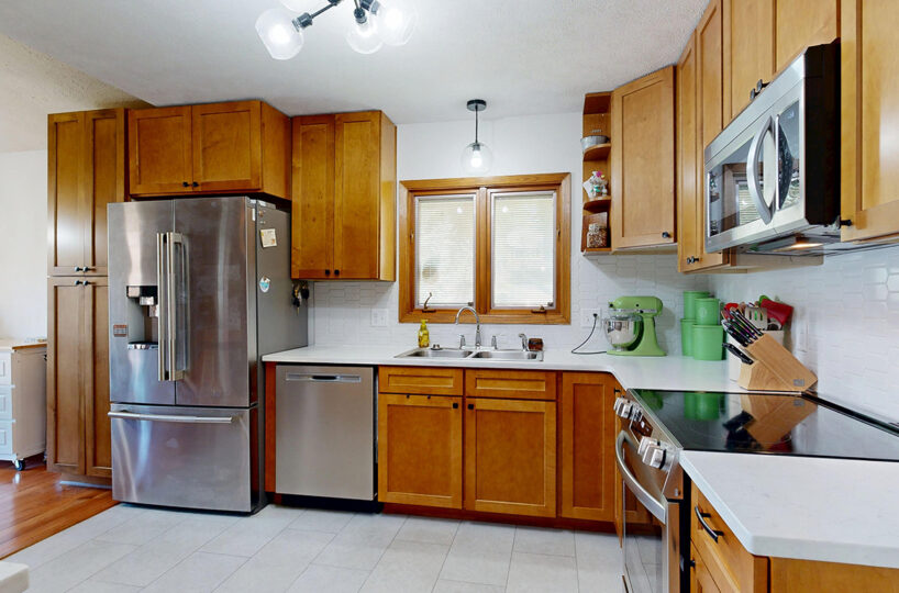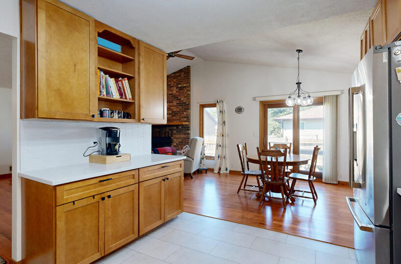 Step into style and comfort with this spacious 3-bedroom, 3-bath home, where modern updates meet wonderful functionality. Featuring newer wood flooring throughout living/dining/hallway on the main floor, this home offers a warm and inviting ambiance from the moment you enter. The heart of the home is the fully remodeled kitchen, boasting solid maple cabinets, sleek quartz countertops, and stainless steel appliances – perfect for both everyday living and entertaining. Each of the three bathrooms is well-appointed, two with updated flooring and newer vanities/countertops. Spacious, light-filled main living area and well-sized bedrooms provide plenty of room to relax and recharge. Primary suite offers you double closets and a private bath. The full basement offers a non-conforming bedroom; family room; bathroom; large laundry room, and a retro bar/rec room that is like looking in a time capsule. Outside you will find a private patio area great for relaxing after a long day. Whether you’re hosting friends or enjoying a quiet evening at home, this beautifully updated property is move-in ready and waiting for you. Don’t miss your chance to own this exceptional home – schedule your private showing today!
